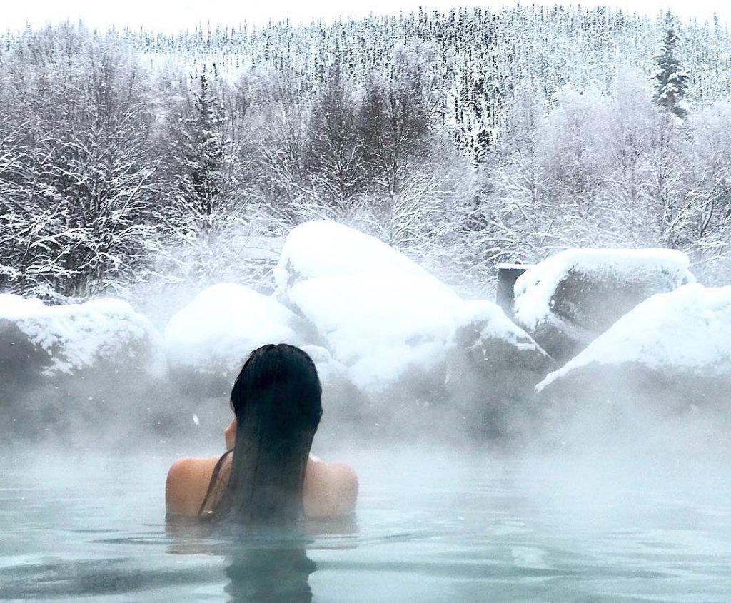 Bains chauds en pleine montagne enneigée